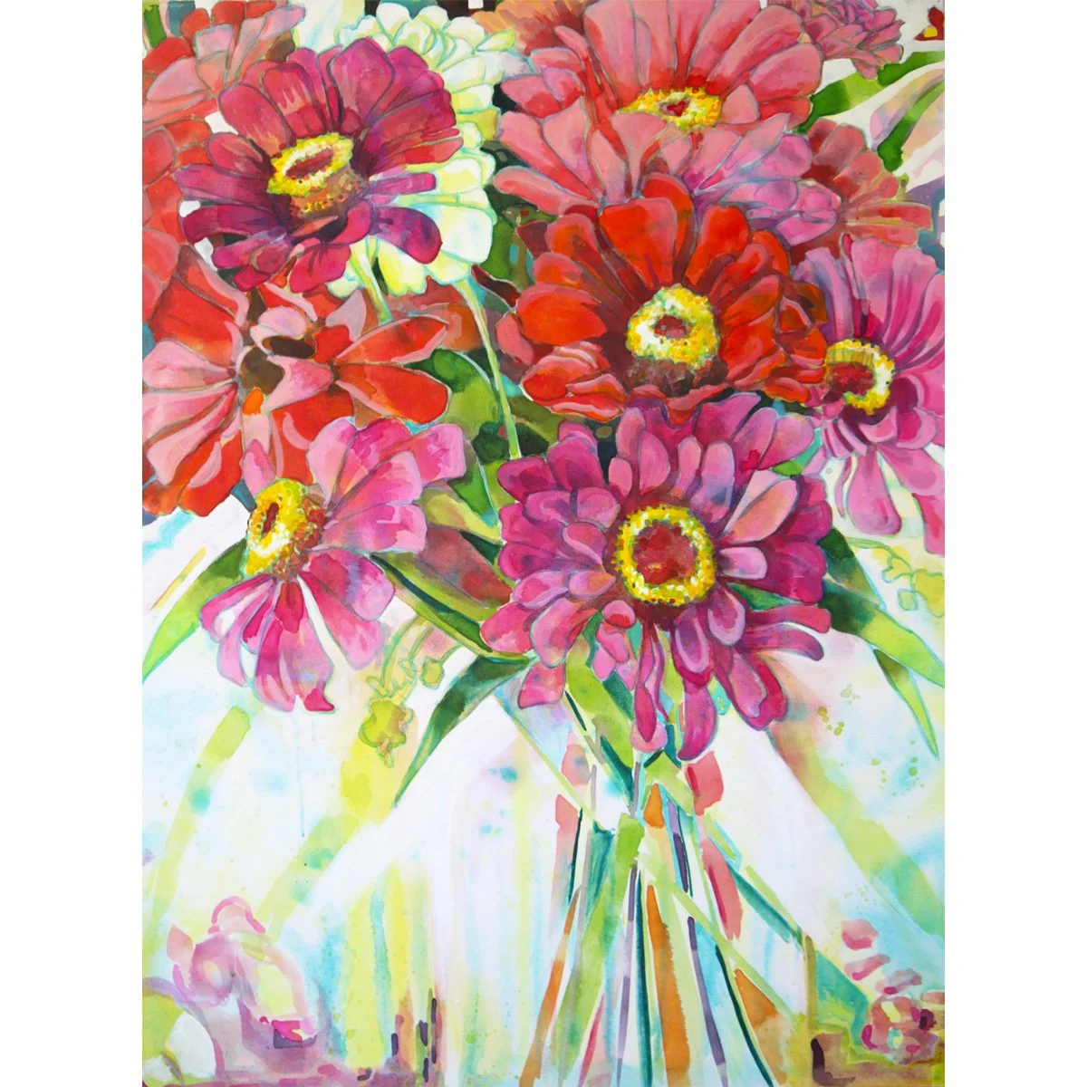 I love this large contemporary bouquet of zinnias. Gathered from many different parts of my garden to create one beautiful bouquet. The many layers showcase the vibrant colors of this painting.