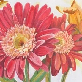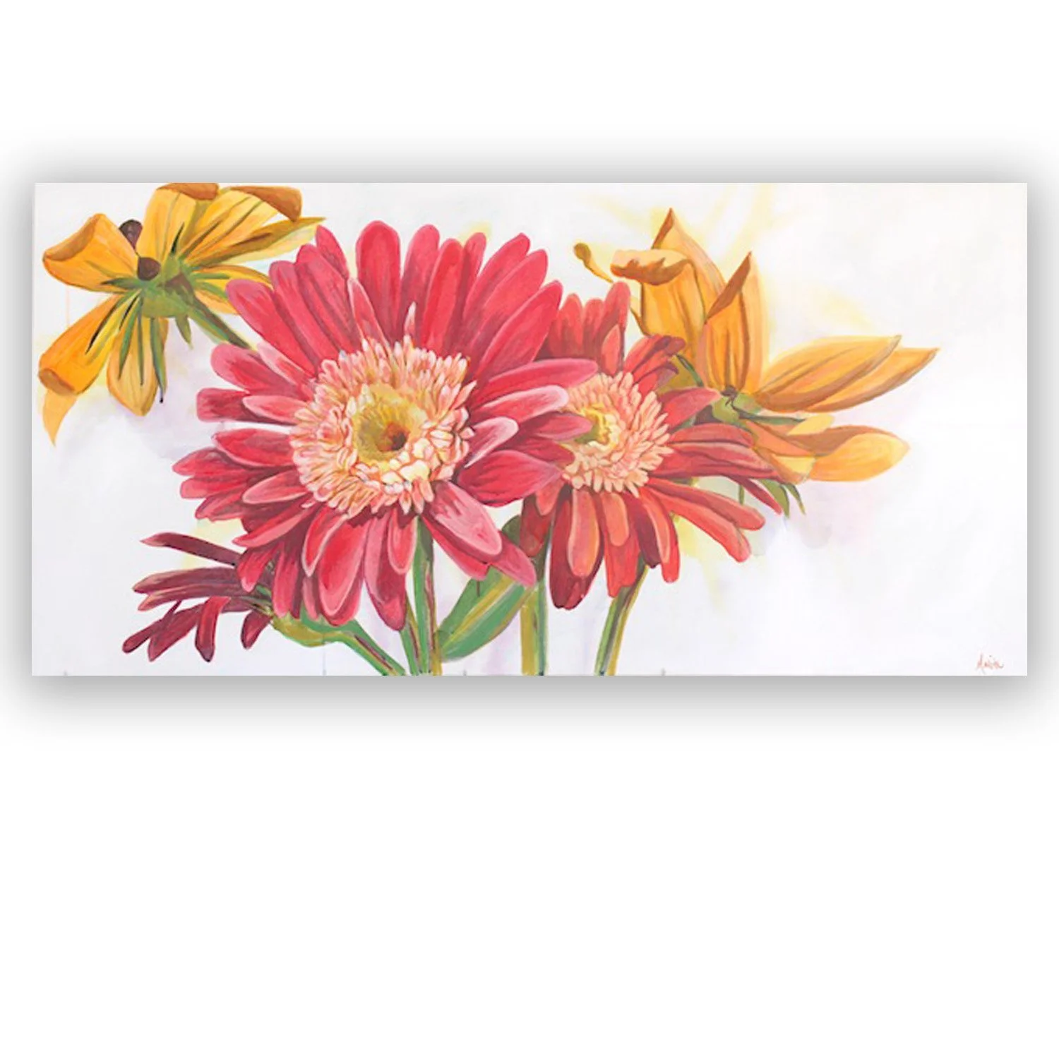 This is a large, contemporary, floral painting on gallery wrap canvas. It measures 24 inches high and 48 inches wide. The sides are finished and the painting is wired for hanging, making this painting easy to hang as is. It can also be framed as you choose.